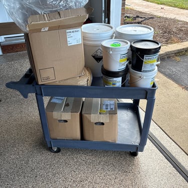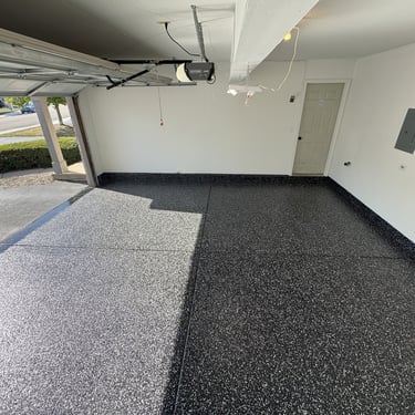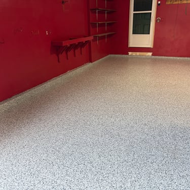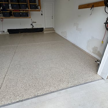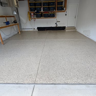 This homeowner was utilizing a big box do it yourself epoxy and recoating every two years. His biggest frustration was emptying the garage and moving all of the belongings back in. We prepared the concrete, filled cracks, and smoothed out spalled areas. We then applied Seal-Kretes Dune Tan Performance Fast Cure Epoxy and broadcast Shoreline flake to rejection. After scraping off excess flake and vacuuming the floor we applied ProRez's ProSpartic for a shiny durable finish.