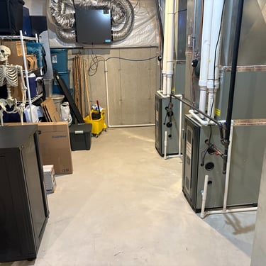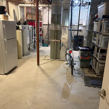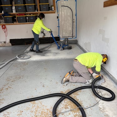 With an existing coating in the main room of the basement and a heavy mastic in the living room of the basement we put some "elbow grease" into the concrete preparation prior to epoxying the floor with 16 mils of 100% solids epoxy. The new coating brightened up the room.