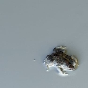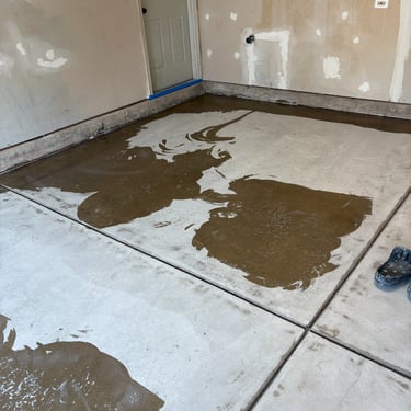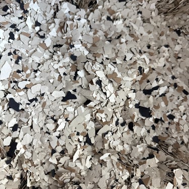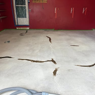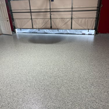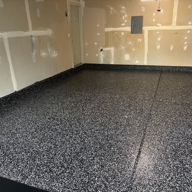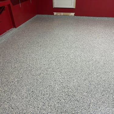 The floor was originally slated to be medium gray, but a toad jumped into the flooring overnight while curing. Repairs were made and we transitioned it to a flake color called "Gravel" from Torginol. There were extra materials and an an additional day of labor in the project, but no change orders were requested. The homeowners graciously contributed to the cost of the flake, and we are appreciative of their support.