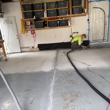 The garage of this farm house was in rough shape due to embedded oil and significant cracks. For this project we degreased the floor and diamond ground the concrete to provide a suitable substrate for the new epoxy floor. After a lot of patching and some minor concreate repairs to smooth crack transitions we installed a 100% solids tan epoxy, 1/4" canyon flake, and low odor polyaspartic top coat with embedded aluminum oxide for slip resistance. With a fresh coat of paint on the drywall and newly installed baseboard the homeowner is ecstatic.