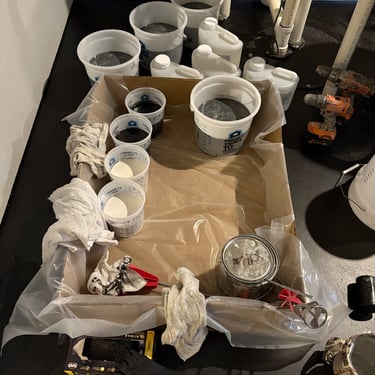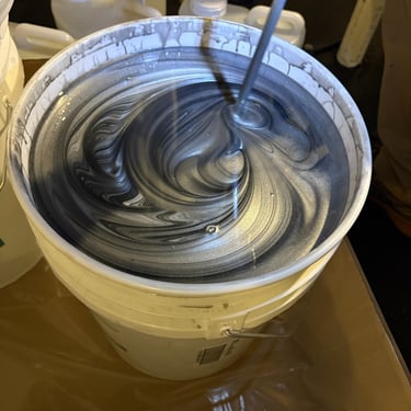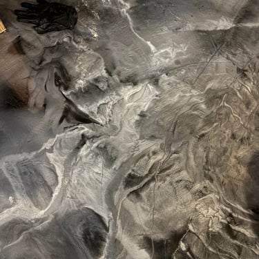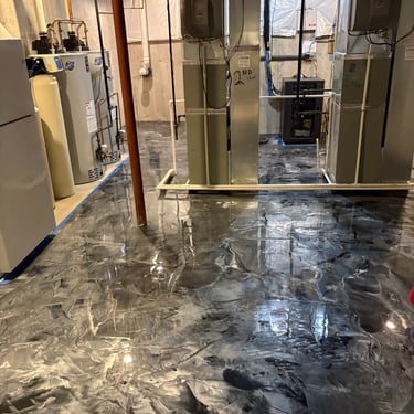 This project started out with a sample board for color approval. Four parts Dolphin gray, one part Great White, and one part Caviar Metallic was the final selection. Concrete was prepared, a black epoxy basecoat was installed and left to cure. Upon return we vacuumed and cleaned the floor again, mixed the metallics, and installed the three color metallic epoxy system. Returning on a third day we protected the epoxy with a layer ProThane Gloss Polyurethane.